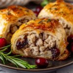 Delicious and savory Turkey and Cranberry Sausage Rolls featuring ground turkey mixed with cranberry sauce and aromatic herbs, all wrapped in golden, flaky puff pastry. Perfect as a festive appetizer or a satisfying snack, these sausage rolls combine juicy meat with a hint of sweetness from the cranberries, baked to crispy perfection.