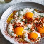 Turkish Eggs, or Cilbir, is a traditional Turkish breakfast dish featuring poached eggs served over creamy yogurt seasoned with garlic and herbs, finished with a warm spiced butter sauce. This quick and flavorful dish combines tangy yogurt, fresh dill and mint, perfectly poached eggs, and a rich buttery chili oil for a delightful balance of textures and flavors.