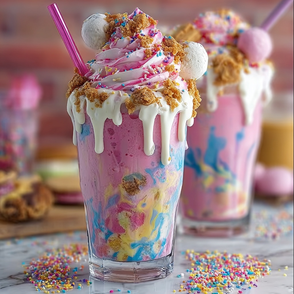Presentation is everything with the Unicorn Fantasy Freakshakes Recipe. Use tall clear glasses to showcase the pastel layers, rim the glass with colored sugar, or add striped straws. For parties, personalize each with name tags or coordinate colors with your theme to make each serving feel extra special.