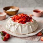 - Prepare Toppings: Once the pavlova is cool, top it generously with vegan whipped cream. Arrange the fresh strawberries or other chosen fruits on top. For an extra touch of flavor and moisture, drizzle with strawberry coulis if desired.
