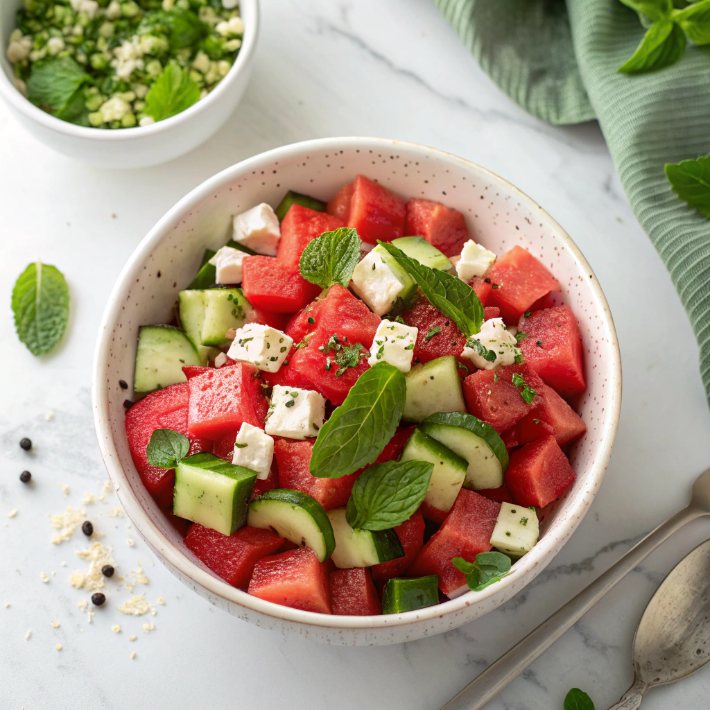 A refreshing and vibrant Watermelon Feta Cucumber Salad combining sweet watermelon, crisp cucumber, tangy feta, and fresh herbs, dressed with a zesty lime and olive oil dressing. Perfect for a light summer dish or side.
